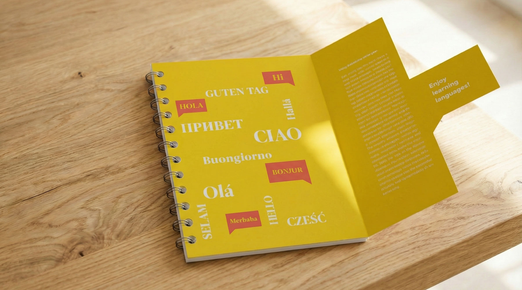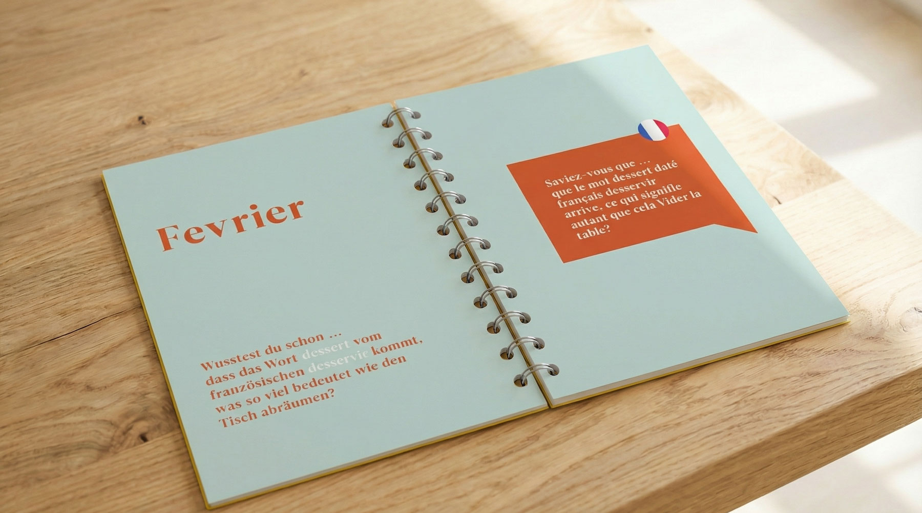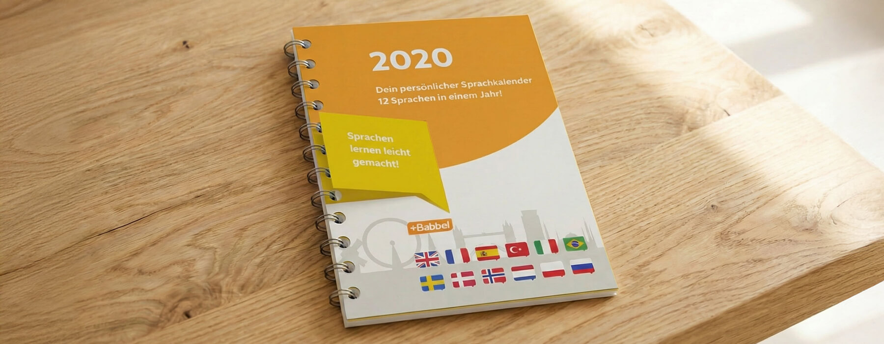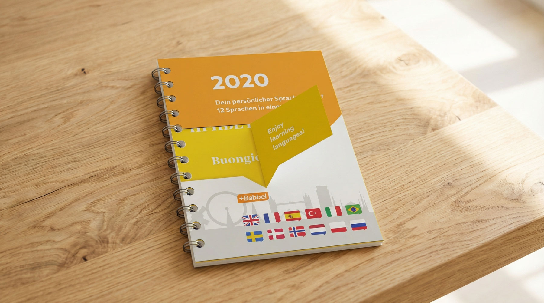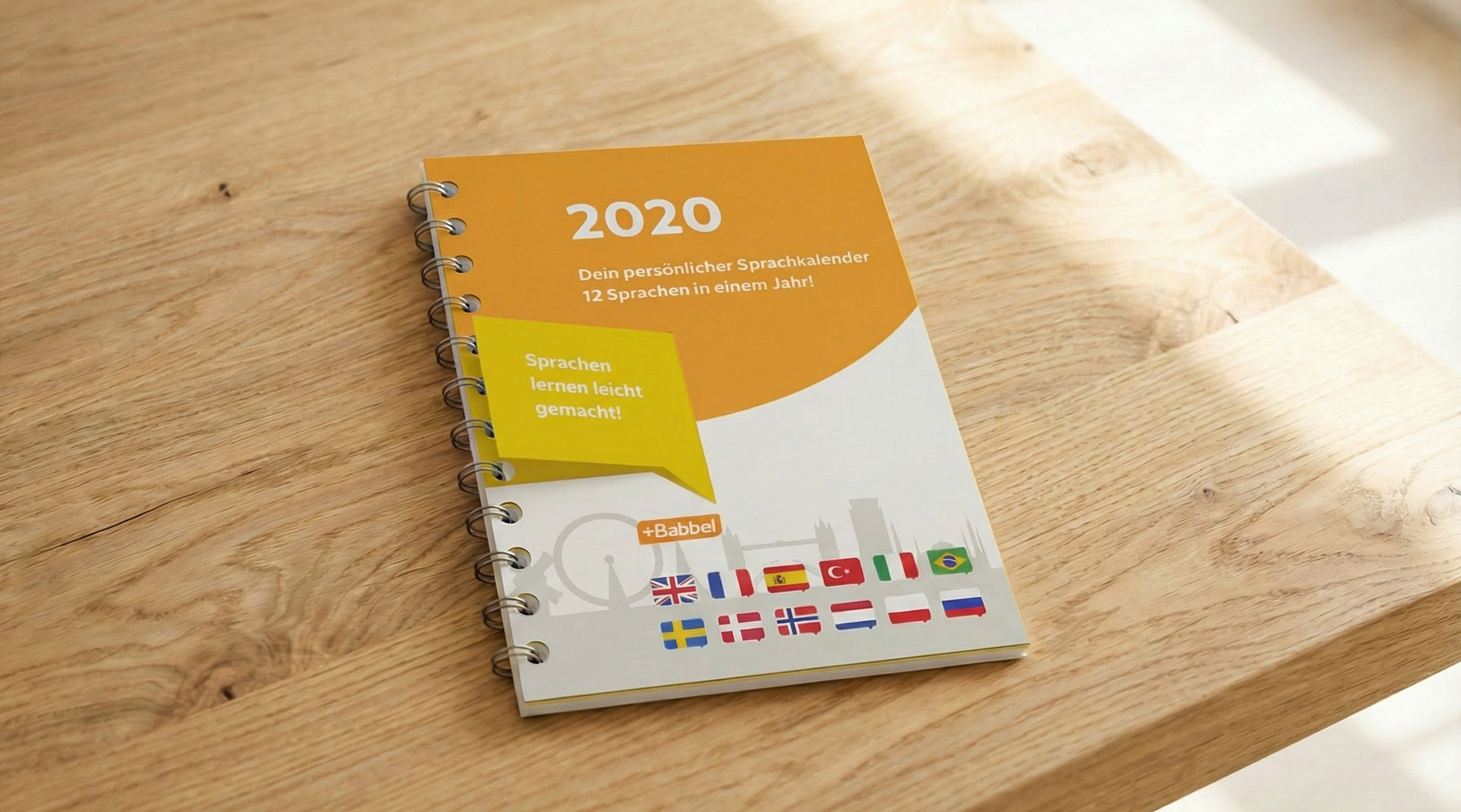 Für die Lernplattform „Babbel“ entwickelte ich einen Wochenkalender, der monatlich wechselnde Sprachübungen bietet. Eine aufklappbare Stanzung in Form einer Sprechblase zeigt die Übersetzungen und macht den Lernprozess interaktiv und spielerisch erfahrbar.